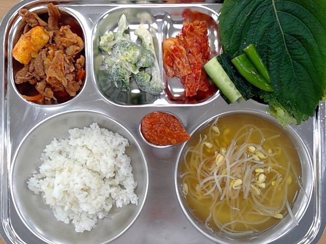 친환경현미밥맑은콩나물국(5.6.9)짬뽕불고기(5.6.9.10.13.16.17.18)브로콜리참깨무침(1.5.6.13)야채쌈(5.6.13)배추김치(9)* 에너지/단백질/칼슘/철639.08/34.97/220.85/3.10