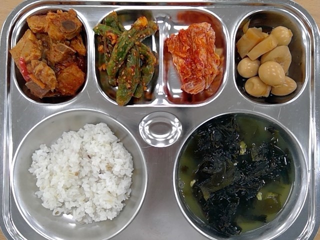 친환경잡곡밥(5)대합미역국(5.6.18)매운돼지갈비찜(5.6.10.13)메추리알곤약조림(1.5.6.13)꽈리고추찜(5.6.13)배추김치(9)* 에너지/단백질/칼슘/철725.40/40.25/244.65/5.34